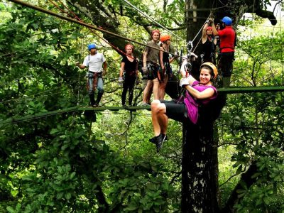 After an invigorating ride through the forest, transition seamlessly into the realm of aerial excitement as you gear up for the zipline portion of your adventure. Ascend to dizzying heights and prepare to defy gravity as you launch yourself into the canopy, suspended by a network of cables that crisscross the verdant expanse below. Feel the rush of wind against your skin as you zip from platform to platform, each offering a panoramic vista of Papagayo’s pristine landscape—a mosaic of emerald greenery, sapphire waters, and azure skies stretching to the horizon. This course features 11 Zip Line Cables, 3 Hanging Bridges and 2 Resting Stations with Water.