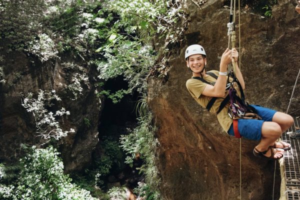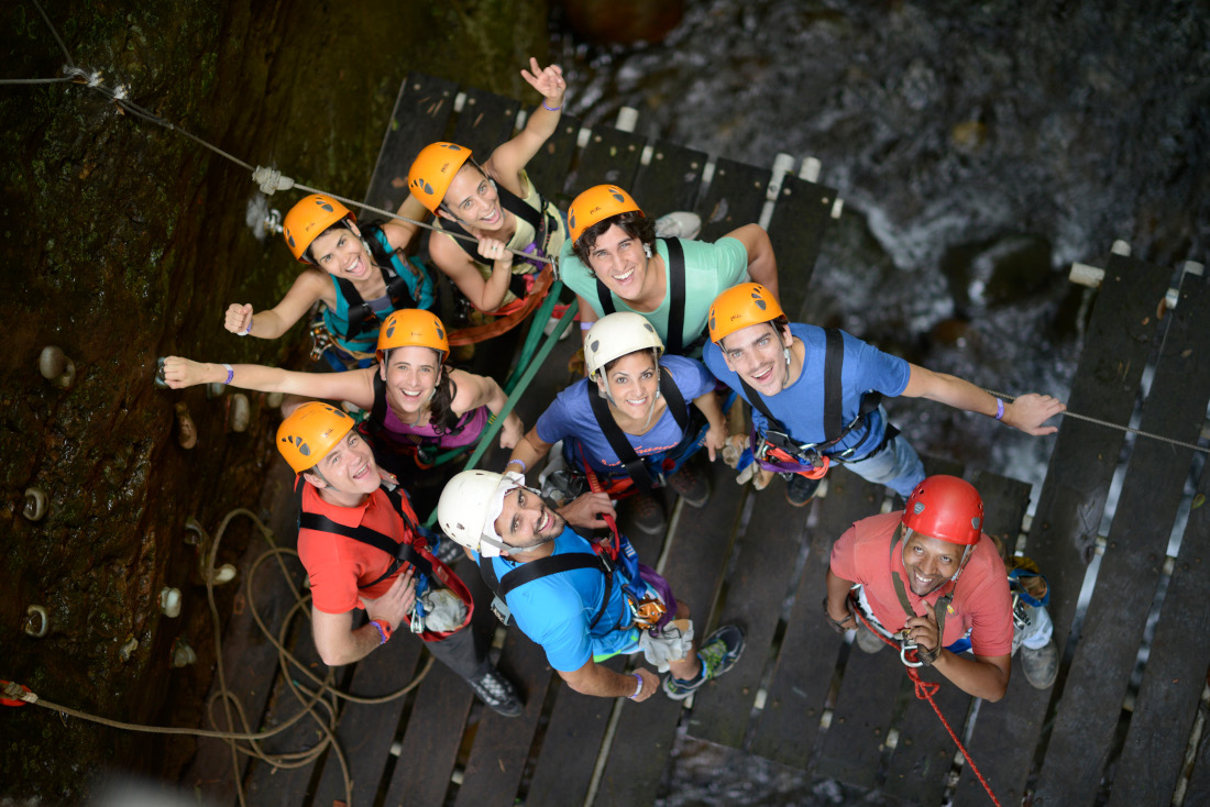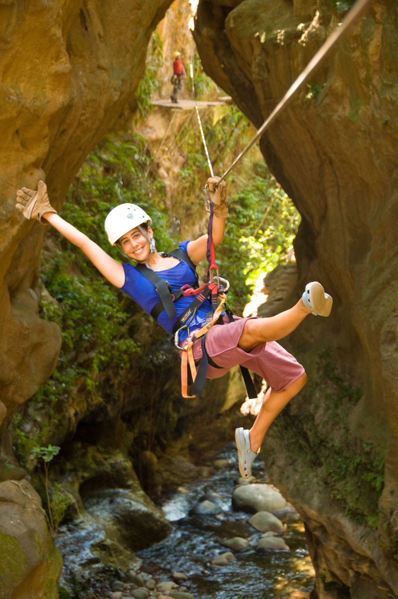 First you will strap into your harness and for the especially dynamic ziplining course! The course is undeniably thrilling, leading through a steep canyon and then over a turbulent river. The course includes a zipline, rappel and rock climb, as well as cross hanging bridges and a Tarzan swing. During the adventure you will encounter 8 zip line cables, 18 platforms, a climbing wall and a hanging bridge, which make for an altogether exhilarating experience.